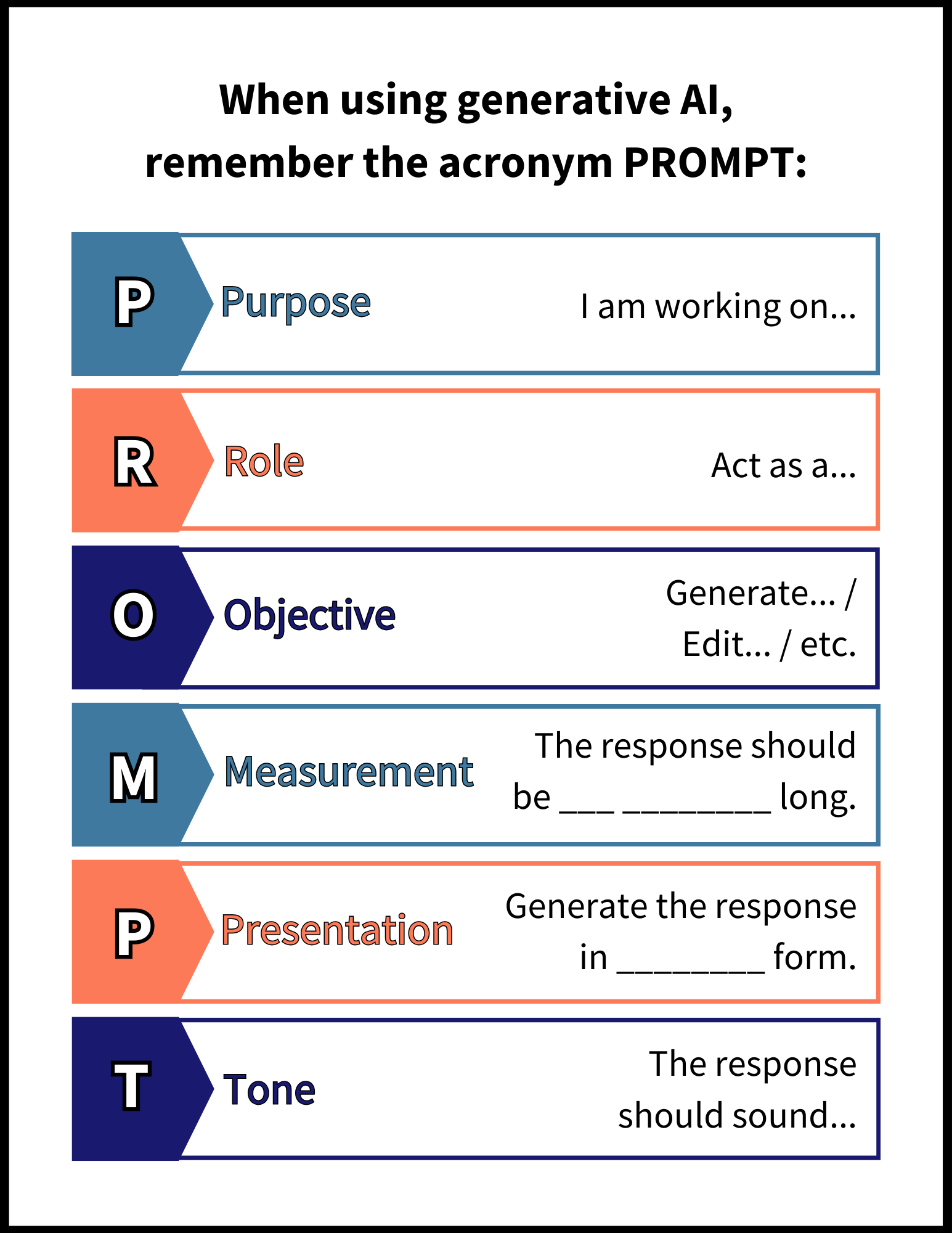 These infographics were created to help the instructional designers on my team at 24/7 Teach. The goal was to provide a quick reference that people could use to craft thorough, effective prompts for ChatGPT and other generative AI tools.