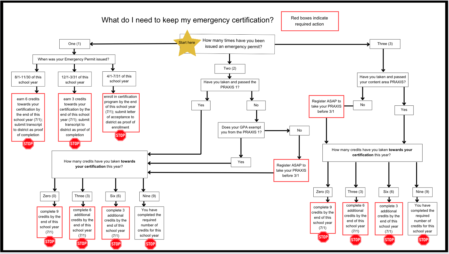 This flowchart was created to help educators working under emergency permits for the 2022-2023 academic year. The goal was to provide a reference that people could use to determine what steps they had to take to maintain an active emergency permit. .